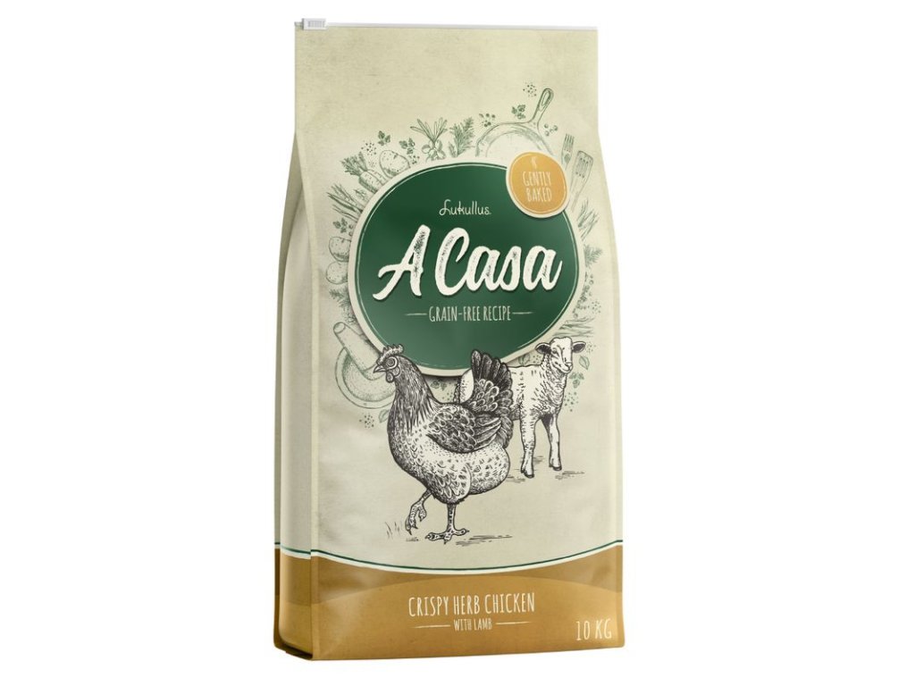 Krmivo Lukullus A Casa křupavé kuře s bylinkami se skládá z jemného, čerstvého kuřecího masa a lahodného jehněčího ve spojení se superpotravinami, jako jsou mrkev, fazole a borůvky. Lososový olej a olej z brutnáku jsou přírodním zdrojem omega 3 a 6 mastných kyselin a jsou součástí složení. Bezobilné krokety byly pomalu, šetrně pečeny tak, aby zůstalo zachováno maximum chuti i kvalita obsažených surovin. Přírodní, rozmanitá receptura dodá psům všechny esenciální živiny. Dokřupava pečené, po rozmarýnu provoněné a doplněné o viditelné kousky lněných semínek a bylin, to je Lukullus A Casa, které chutná jako s láskou doma připravené.