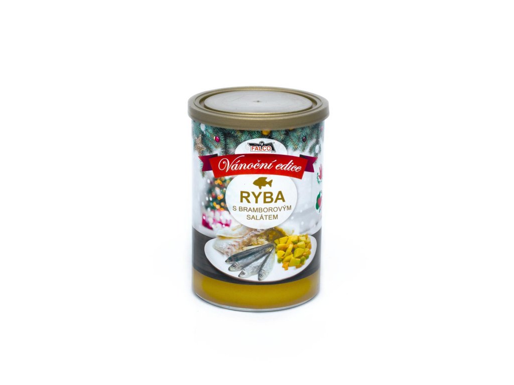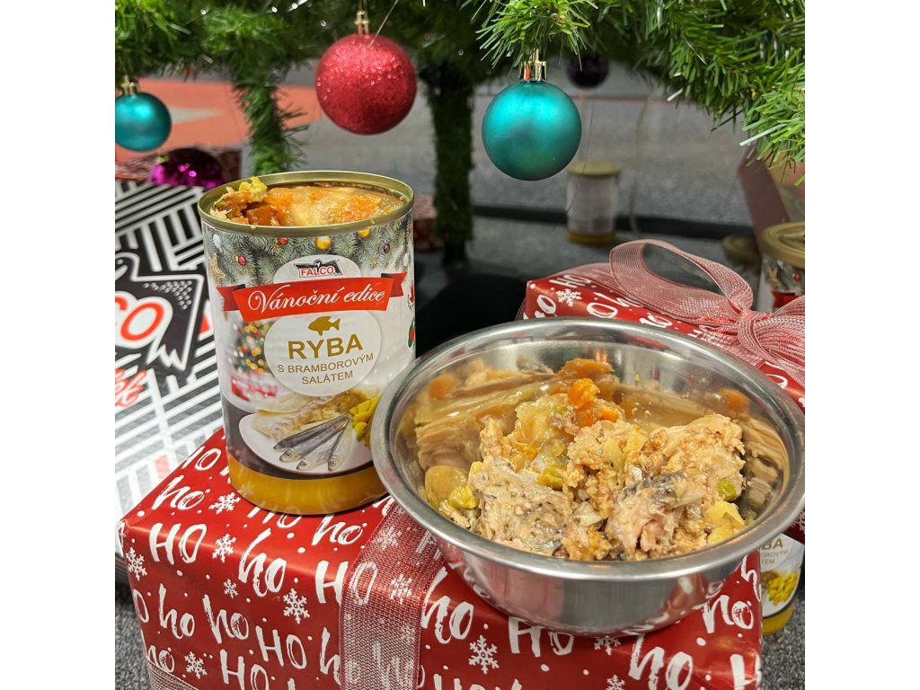 Složení: Ryby, mrkev 5%, hrášek 5%, brambory 10%.